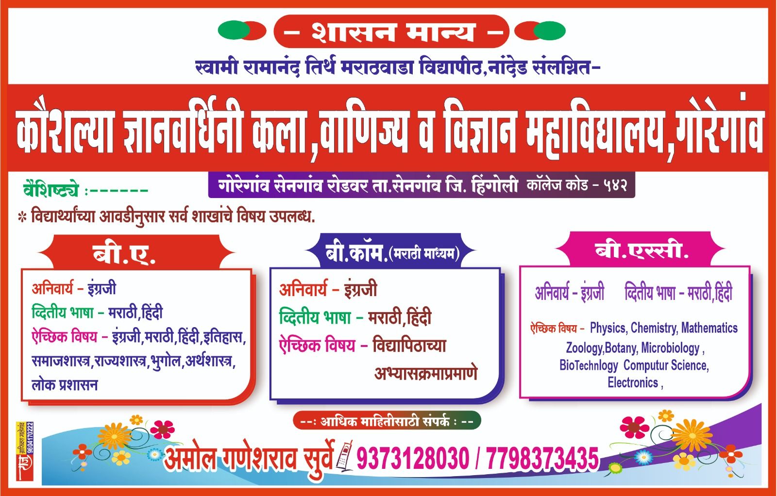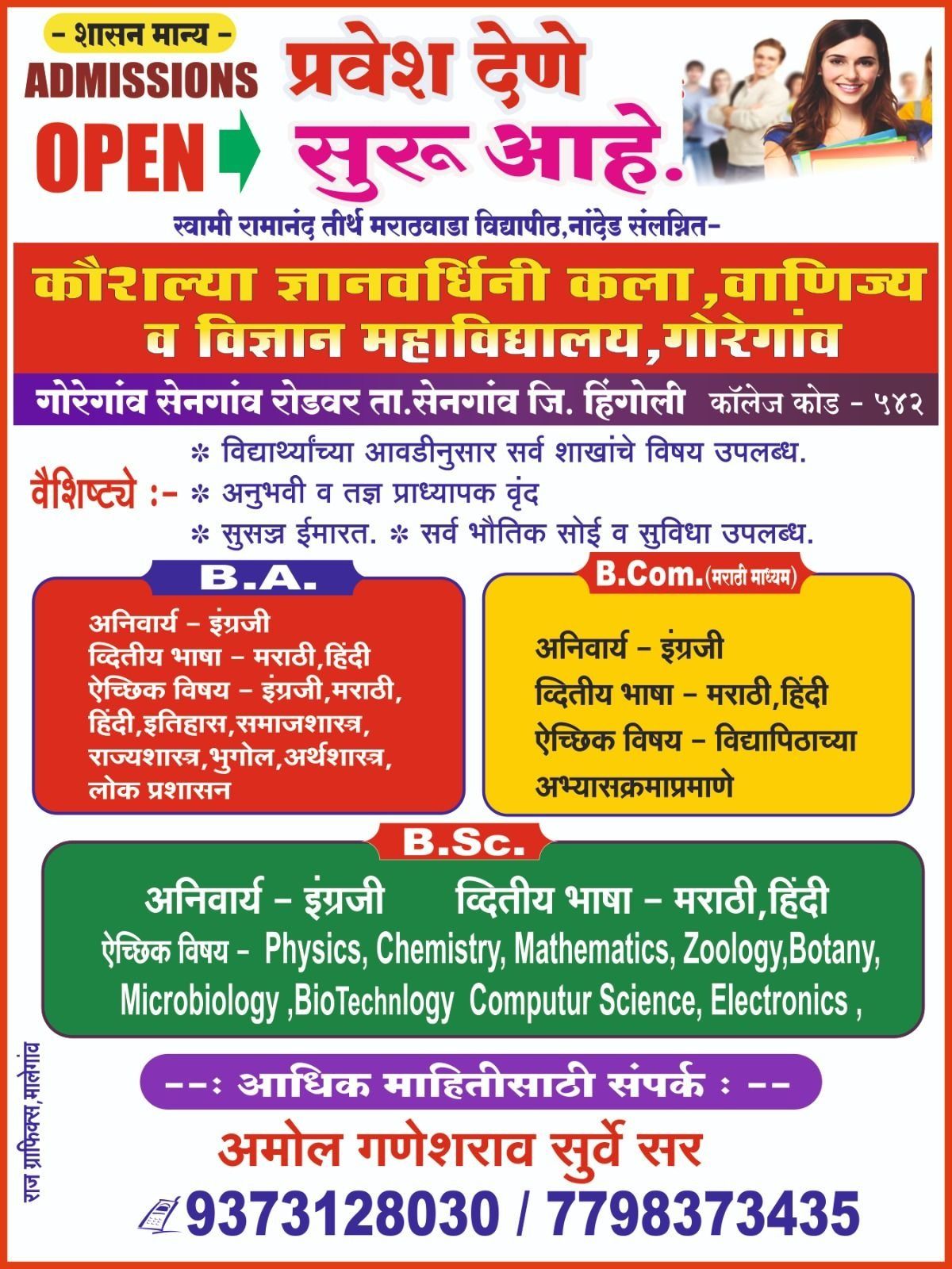 • 🎓 Quality Education with Values विद्यार्थ्यांच्या सर्वांगीण विकासावर भर देणारे गुणवत्तापूर्ण शिक्षण. 👩‍🏫 Experienced & Dedicated Faculty अन AIM आणि NEP-2020 नुसार अध्यापन करणारे अनुभवी व मार्गदर्शक प्राध्यापक. 📚 Arts, Commerce & Science Faculties BA, BCom, BSc अभ्यासक्रमांची सुविधा एकाच कॅम्पसमध्ये. 🏫 Student-Friendly Campus शांत, सुरक्षित व अभ्यासाला पोषक शैक्षणिक वातावरण. 💻 Modern Teaching & Learning Methods डिजिटल क्लासरूम, सेमिनार, वर्कशॉप आणि प्रॅक्टिकल-आधारित शिक्षण. 🧪 Well-Equipped Laboratories & Library अद्ययावत प्रयोगशाळा आणि समृद्ध ग्रंथालय सुविधा. 🏃 Co-Curricular & Extra-Curricular Activities NSS, क्रीडा, सांस्कृतिक कार्यक्रम आणि व्यक्तिमत्व विकास उपक्रम. 🎯 Career Guidance & Skill Development स्पर्धा परीक्षा मार्गदर्शन, कौशल्य विकास आणि करिअर समुपदेशन. 🤝 Inclusive & Supportive Environment सर्व घटकांतील विद्यार्थ्यांसाठी समतोल, समावेशक व प्रेरणादायी वातावरण. 📍 Easy Accessibility At Post Goregaon, Tal. Sengaon, Dist. Hingoli – ग्रामीण भागातील विद्यार्थ्यांसाठी सहज उपलब्ध.