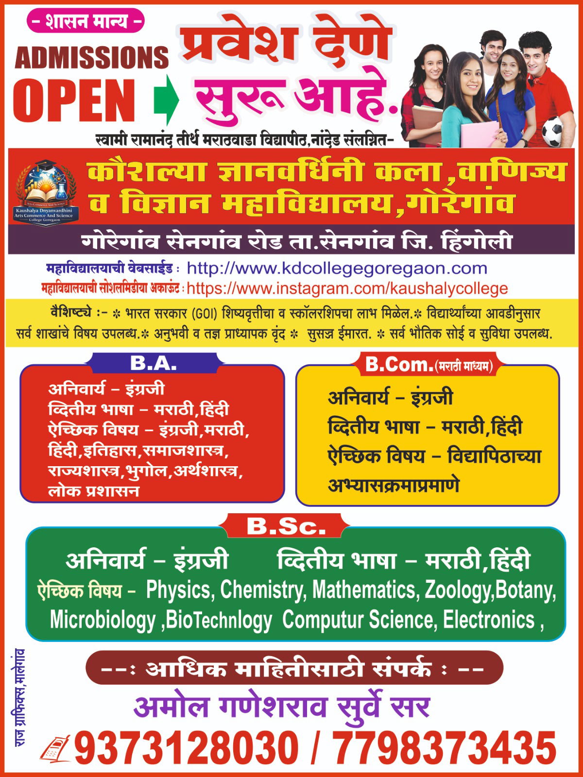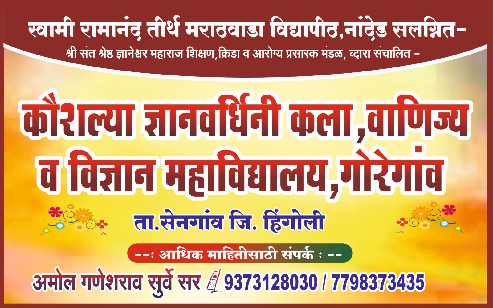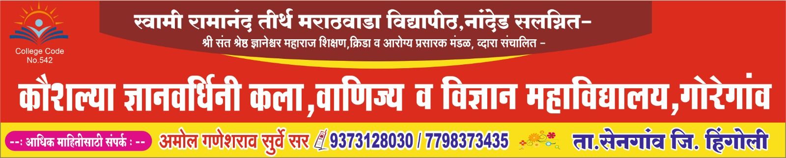 • Kaushalya Dnyanvardhini Arts, Commerce & Science College At Post Goregaon, Taluka Sengaon, District Hingoli – 431703, Maharashtra, India 🇮🇳 Landmark: Near Goregaon Village Centre / Main Road / Bus Stophttps://maps.app.goo.gl/wGhPw38FyyiWyr1A6